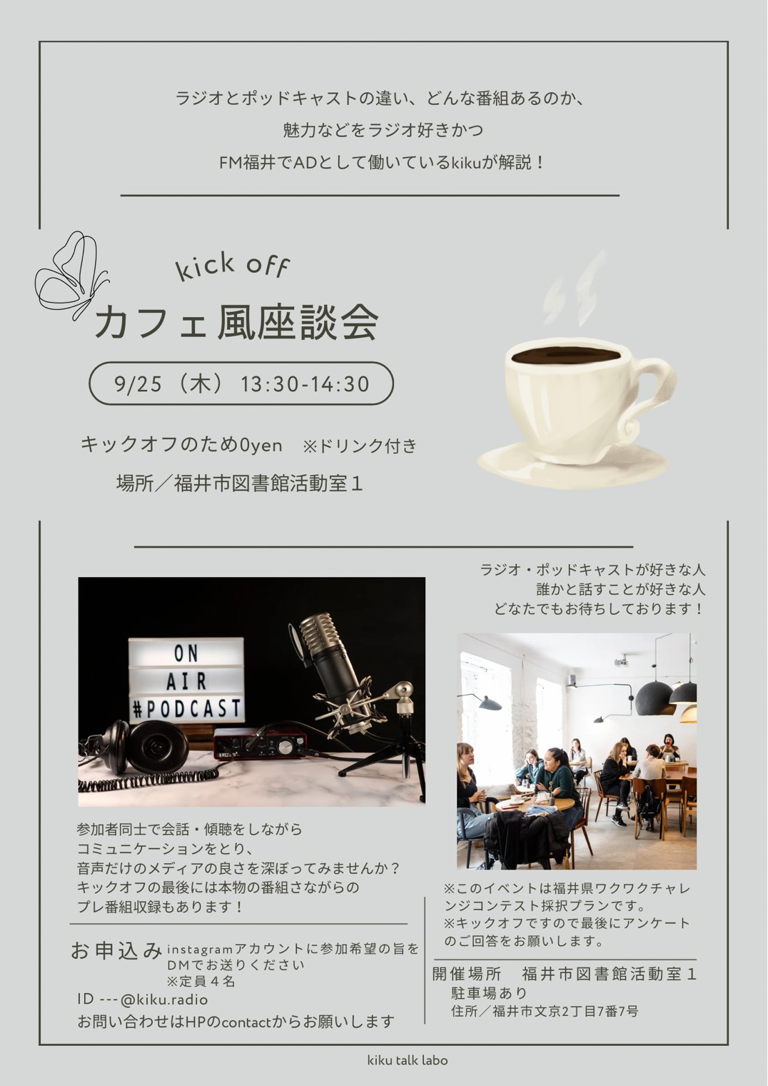 場所は福井市図書館の活動室。若者5名が参加し、ラジオやポッドキャストについて知るとともに、実際にプレ番組の収録にトライしました。アンケート結果から、音声コンテンツによる発信文化への理解が深まるとともに、ラジオやポッドキャストが若者の居場所づくりにつながる可能性が明らかになりました。さらにはこのイベントを通じて、新たな化学反応が具体的に生まれつつあります。