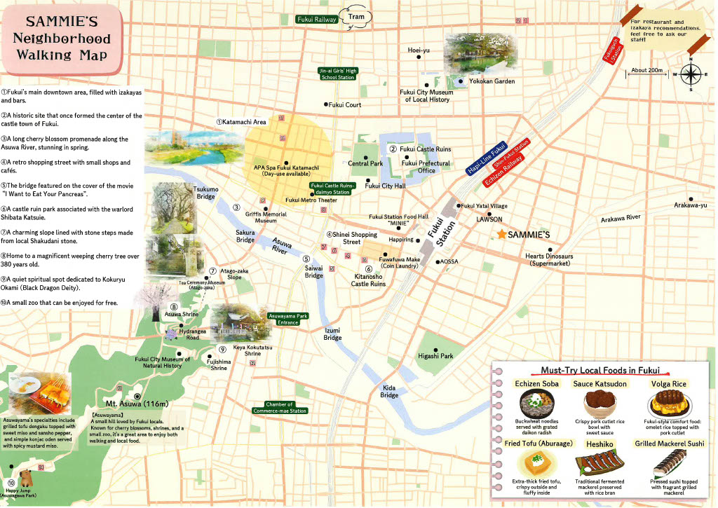 国際地域学部の3年生1名が、専門科目「課題探求プロジェクト(PBL)」の一環で、「SAMMIE’S周辺まち歩きマップ」を作成しました。福井駅近くのゲストハウス「SAMMIE’S」の宿泊者向けに、周辺の飲食店や物販店、おすすめ観光スポットなどを紹介するもので、日本語版と英語版があります。半年前に作成したマップを、宿泊者からのフィードバック等を踏まえ改善したものです。